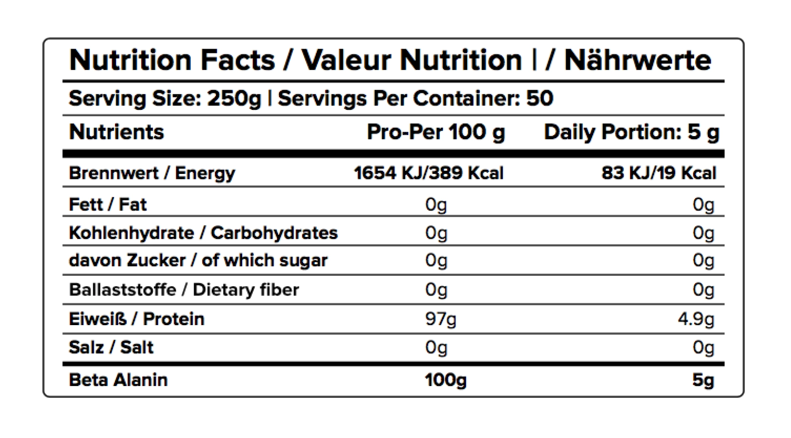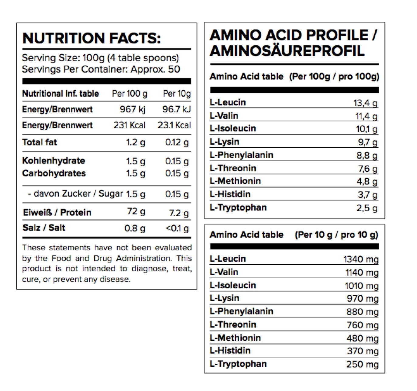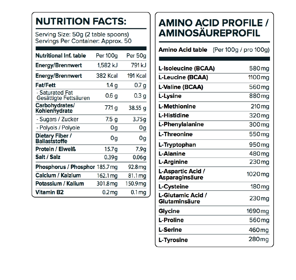 NUTRIENT PER 100G PER 30G Energy 1536 KJ / 362 Kcal 460 KJ / 108 Kcal Fat 1.2 g 0.4 g – Saturated Fatty Acids 0.7 g 0.2 g Carbohydrates 1.5 g 0.45 g – of which Sugar 0.5 g 0.15 g Protein 90 g 27 g Salt 0.2 g 0.06 g Amino Acid Profile (per 100g protein) :