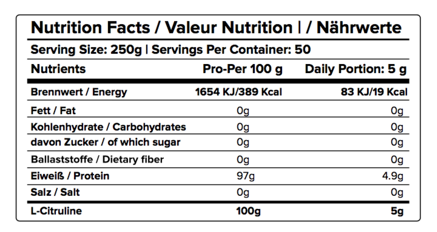 AMINO ACID AMOUNT (MG) L-Isoleucine 6700 mg L-Leucine 10500 mg L-Valine 6100 mg L-Lysine 9500 mg L-Methionine 2100 mg L-Histidine 1600 mg L-Phenylalanine 3200 mg L-Threonine 7400 mg L-Tryptophan 1600 mg L-Alanine 5100 mg L-Arginine 2400 mg L-Aspartic Acid 11200 mg L-Cystine 2300 mg L-Glutamic Acid 17500 mg Glycine 1800 mg L-Proline 6100 mg L-Serine 5800 mg L-Tyrosine 3000 mg